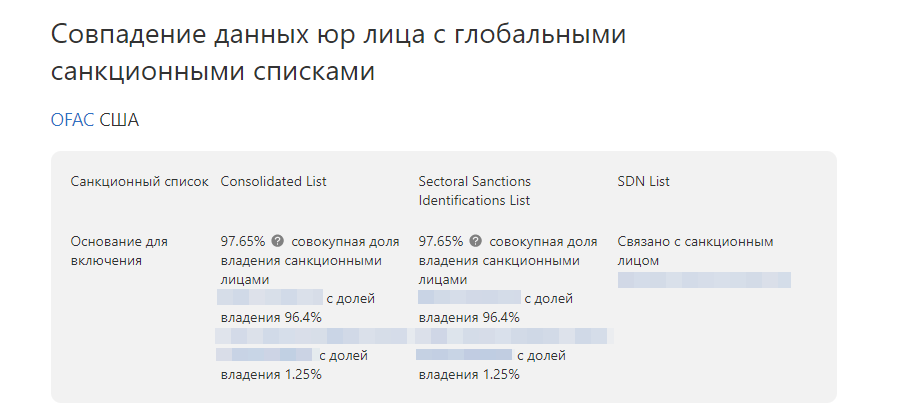 Если проверяемая компания не включена ни в один из санкционных списков, но под санкциями учредители этой организации, Призма покажет эти сведения. На странице сервиса отобразятся доли владения компанией и санкционные списки, в которые внесены ее владельцы.